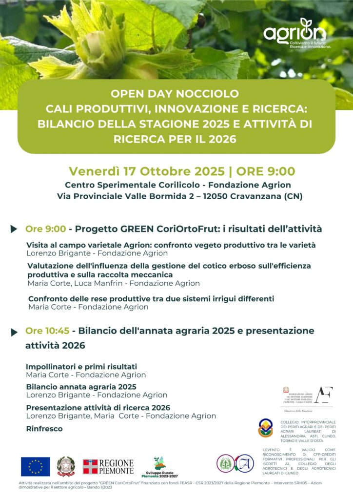 La sezione corilicola di Fondazione Agrion organizza un Open Day, venerdì 17 ottobre, presso la propria sede in Strada provinciale valle Bormida 2, Cravanzana (CN).