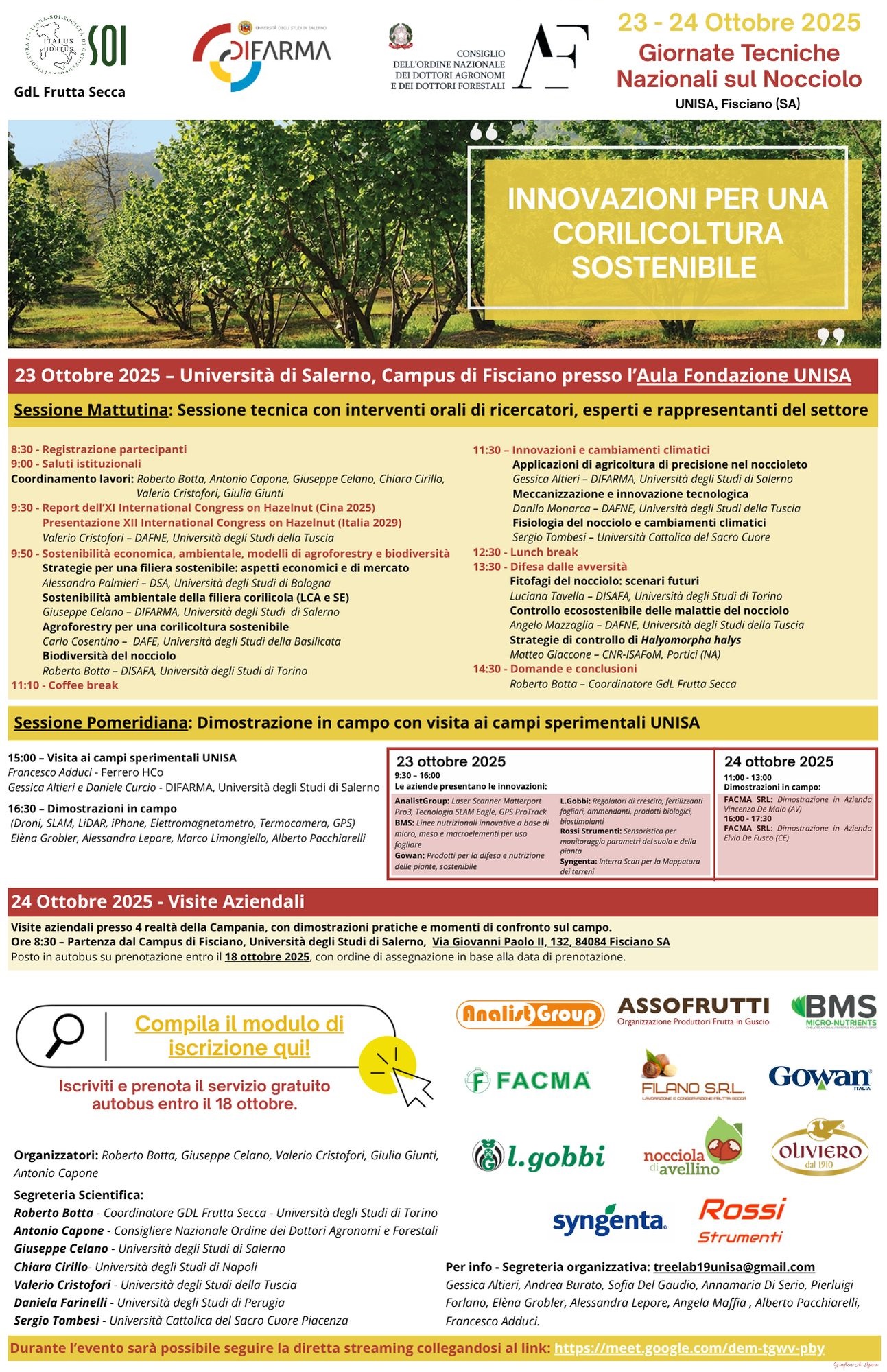 Il Gruppo di Lavoro SOI Frutta Secca con il DIFARMA organizzano le “Giornate Tecniche Nazionali sul Nocciolo” che si svolgeranno giovedì 23 e venerdì 24 ottobre 2025, presso l’Università di Salerno, Dipartimento di Farmacia, Fisciano.