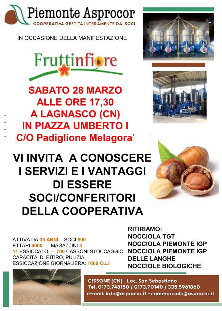La Cooperativa corilicola PIEMONTE ASPROCOR, sarà presente con un proprio stand alla manifestazione FRUTTINFIORE che si terrà il 27-28-29 marzo 2026 a Lagnasco (CN).