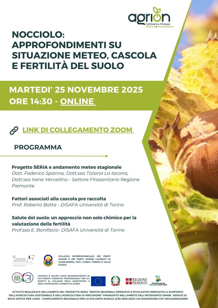 La Fondazione Agrion organizza un webinar dedicato ad approfondimenti su situazione meteo, cascola e fertilità del suolo del nocciolo. L’evento si terrà martedì 25 novembre alle ore 14,30 on line