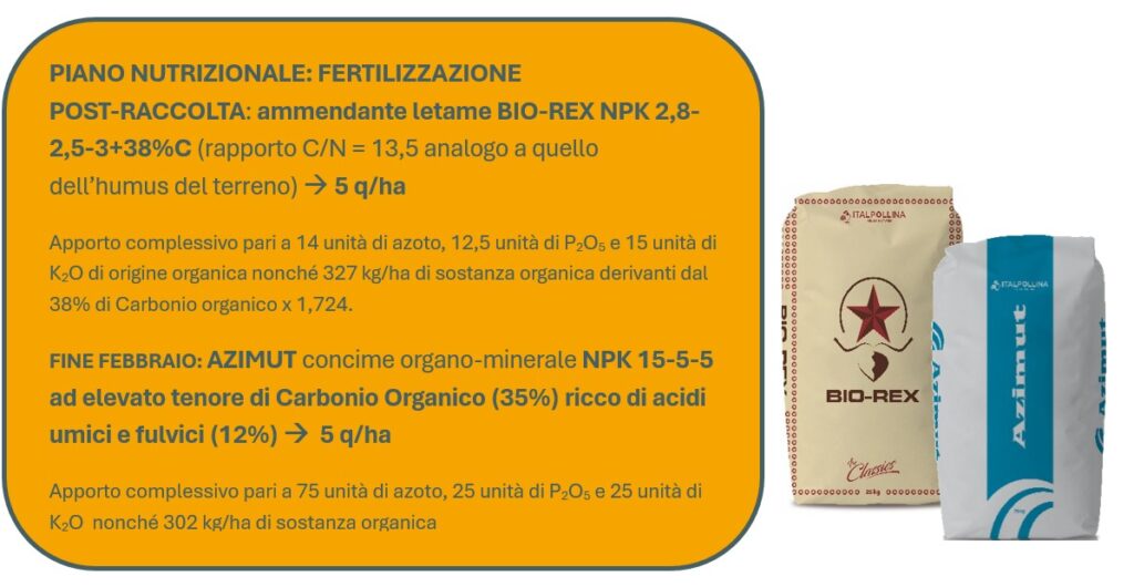 Il piano nutrizionale adottato nell’azienda oggetto di studio si fonda su una fertilizzazione organica e organo-minerale finalizzata a garantire un apporto equilibrato di nutrienti e, soprattutto, a incrementare il livello di sostanza organica del suolo, elemento centrale per la funzionalità del sistema suolo–pianta (Hello Nature/Italpollina).
