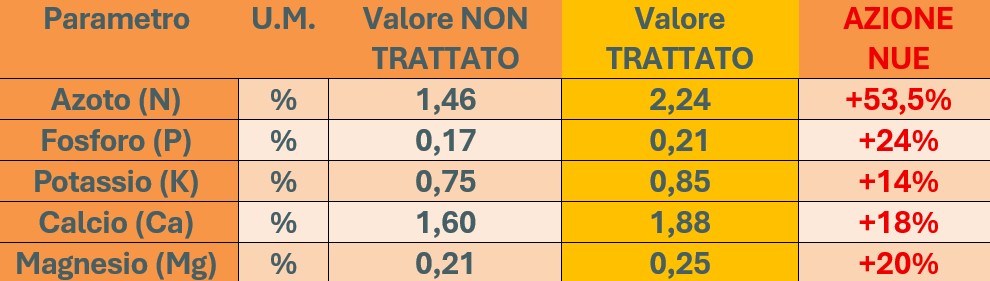 Nella tesi trattata si osserva un incremento dell’azoto fogliare pari al +53,5%,  parallelamente risultano più elevati anche i livelli di fosforo (+24%), potassio (+14%) e calcio (+18%), oltre a un miglior equilibrio dei microelementi.