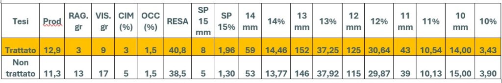 La produzione per ettaro risulta pari a 12,9 q/ha nella tesi trattata e 11,3 q/ha nella tesi non trattata. La resa in sgusciato aumenta dal 38,5% del non trattato al 40,8% del trattato. In un’annata caratterizzata da forti perdite di prodotto e basse rese ad ettaro, il differenziale produttivo ottenuto assume un significato agronomico ancora più rilevante.