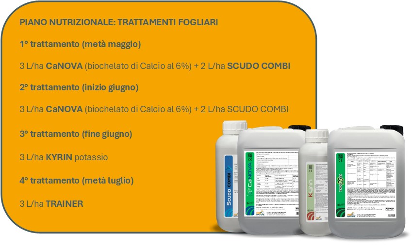 Alla concimazione di base è stato affiancato un programma di trattamenti fogliari basato su prodotti a duplice funzione nutrizionale e biostimolante ad azione NUE registrati CE (Hello Nature/Italpollina), finalizzati a sostenere la fisiologia della pianta nelle fasi di maggiore richiesta nutrizionale e in condizioni ambientali potenzialmente limitanti grazie all’elevato contenuto di peptidi di origine vegetale ottenuti per idrolisi enzimatica.